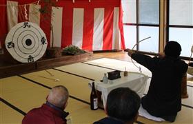 木浦鉱山の先、落水区的はり祭りは江戸時代から伝わる珍しい祭りで、旧正月16日に行われている。直径約1mの割竹と障子紙などで作った的の表に「東・西・南・北」を、裏の中心に「鬼」の文字を書き、弓と矢を3本を用意します。祭りが始まると、山神様に御神酒を供えて、弓矢で的を撃ちます。参加者全員が打ち終えると、長老が矢の当たった位置で、農業や林業、狩猟などの良否を占い、今年の作柄や諸々の方位、注意事項などを説明し、中心の鬼を射抜けば、自分の願いを叶えられるともいわれています。
