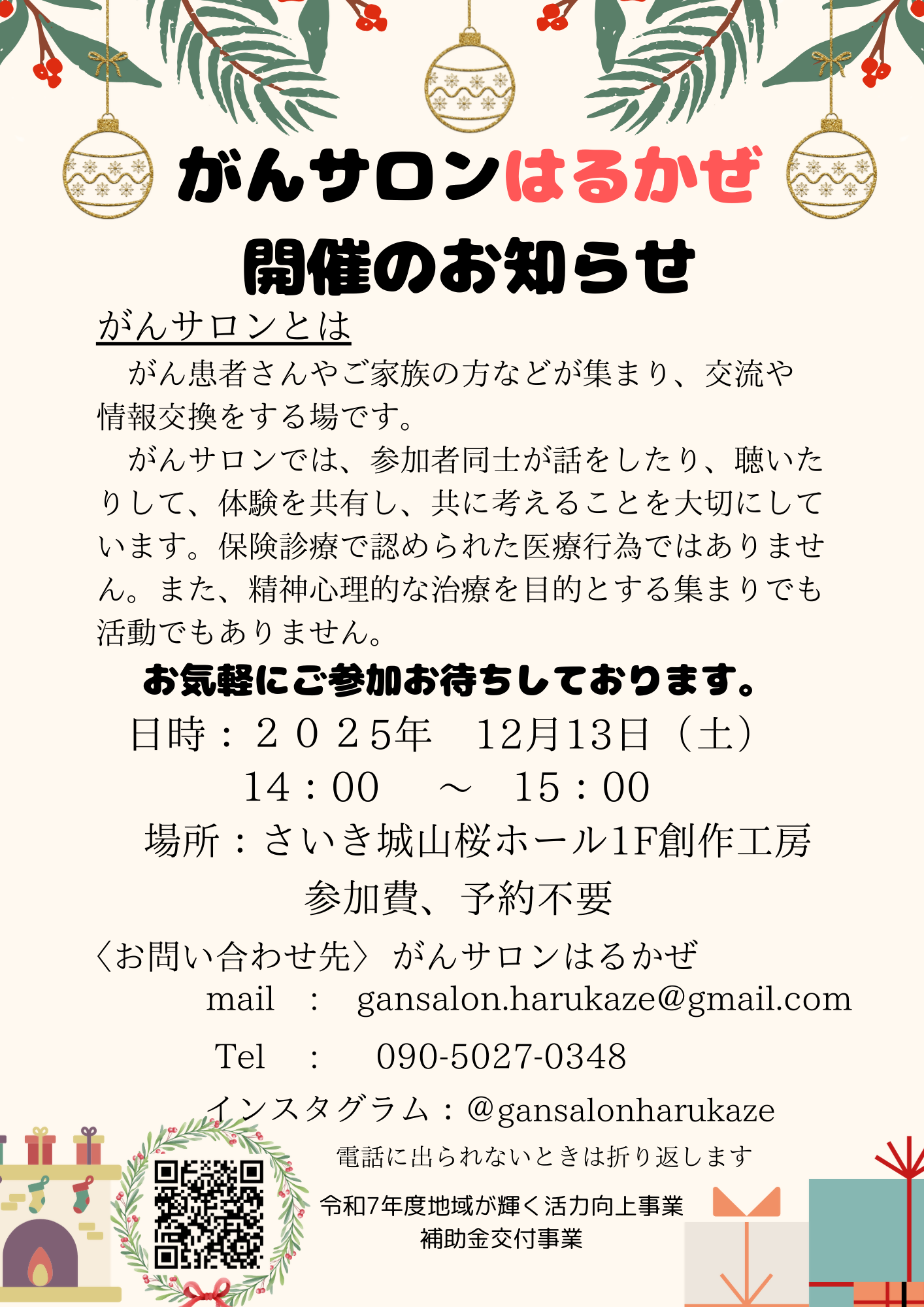 がんサロンはるかぜ開催のお知らせ 最終更新日:2025年11月26日 がんサロンはるかぜが開催されます。がんサロンとは、がん患者さんやご家族の方などが集まり、交流や情報交換をする場です。参加者同士が話をしたり聴いたりして体験を共有し、共に考えることを大切にしています。ぜひ、お気軽にご参加ください。※保険診療で認められた医療行為や、精神心理的な治療を目的とするものではありません。がんサロンはるかぜ開催のお知らせ 日 時:令和7年12月13日(土曜日)14時00分~15時00分場 所:さいき城山桜ホール 1F 創作工房参加費:不要予 約:不要主 催:がんサロンはるかぜ