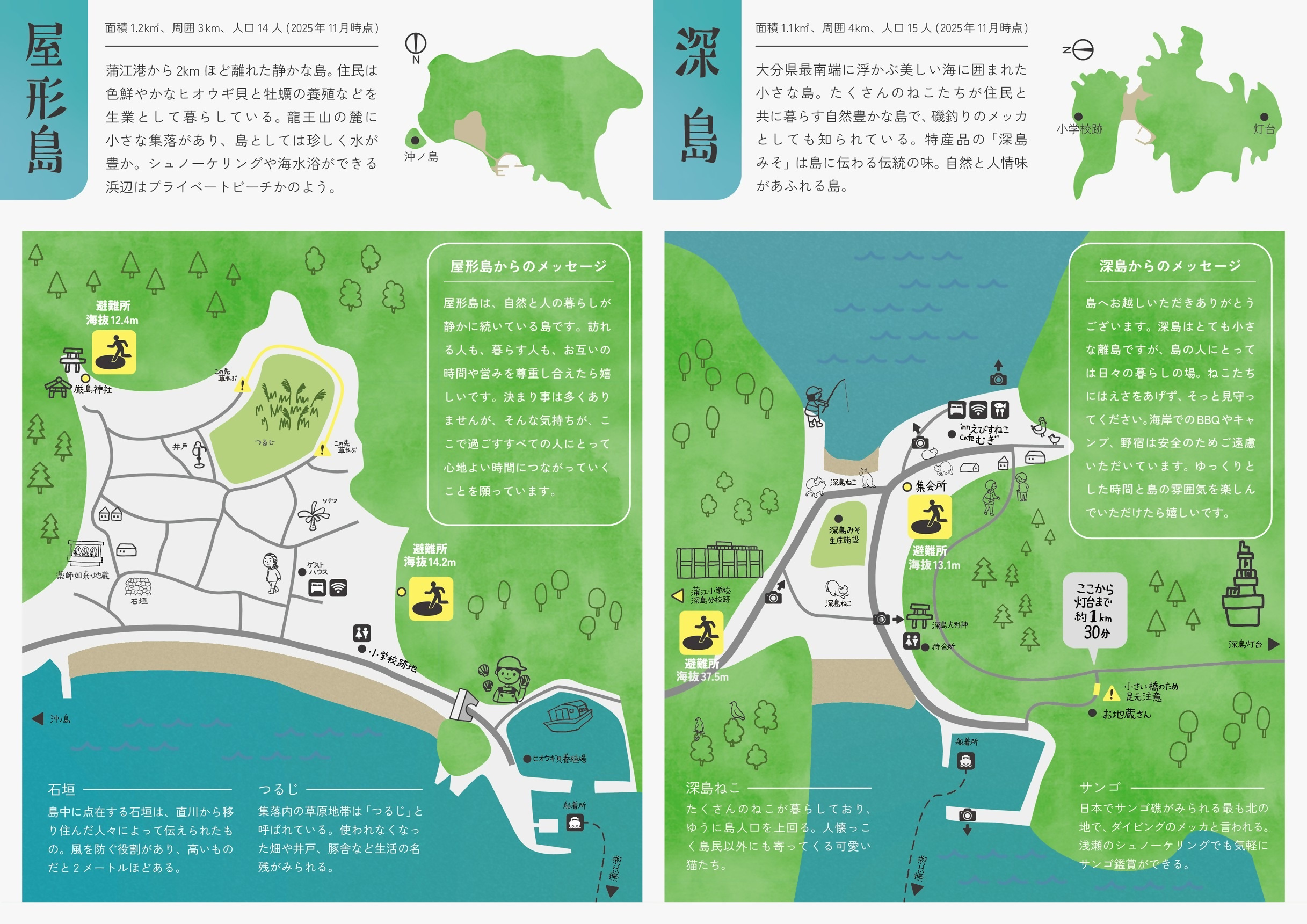 屋形島&深島あんしんガイドができました! 最終更新日:2026年1月29日 「屋形島&深島あんしんガイド」ができました! 佐伯市蒲江の離島である屋形島と深島に観光等で訪れる方に向けたガイドパンフレットができました。 島の紹介や避難場所、マナー啓発などを掲載したかわいらしいパンフレットです。 島に訪れる際はぜひご活用ください。屋形島&深島あんしんガイド(表) 屋形島&深島あんしんガイド(裏) 屋形島&深島あんしんガイド(PDF:785.4キロバイト)