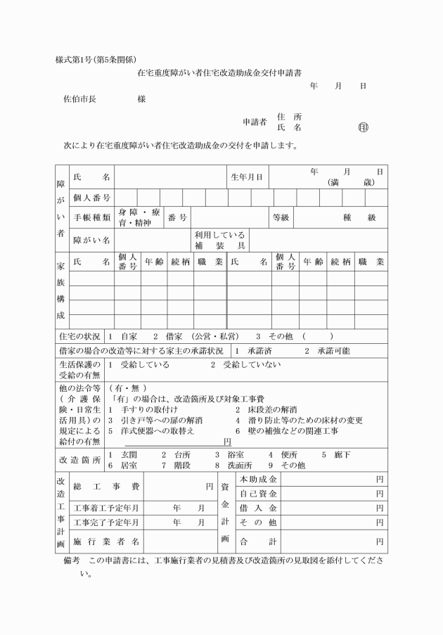 第5条 助成金の交付を受けようとする助成対象者(以下「申請者」という。)は、在宅重度障がい者住宅改造助成金交付申請書(様式第1号)に次に掲げる書類を添えて市長に提出しなければならない。