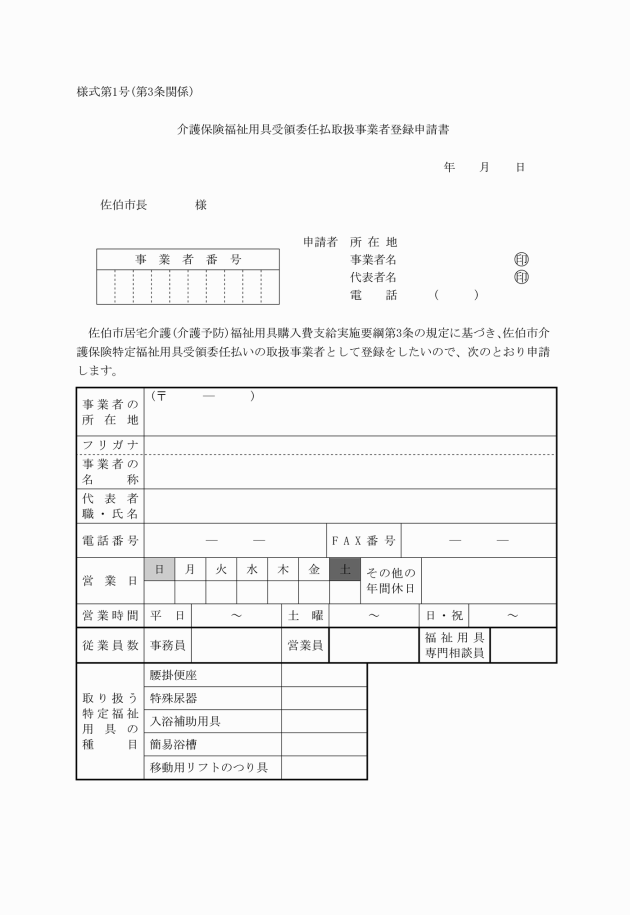第4条 受領委任払取扱事業者は、福祉用具事業者登録申請書の記載内容に変更があったときは、介護保険福祉用具受領委任払取扱事業者変更申請書(様式第4号)により速やかに市長に届け出なければならない。