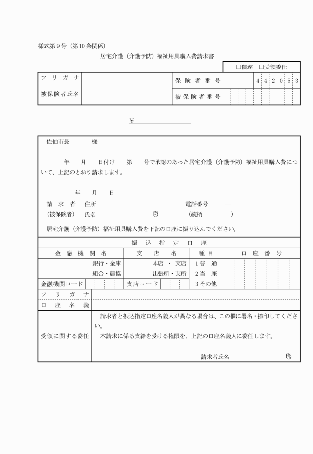 第10条 支給申請者は、当該福祉用具の購入後、居宅介護(介護予防)福祉用具購入費請求書(様式第9号)に次に掲げる書類を添えて市長に提出しなければならない。