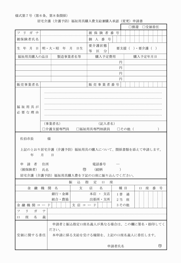 第6条 居宅介護福祉用具購入費等の支給を受けようとする居宅要介護被保険者等(以下「支給申請者」という。)は、当該申請に係る福祉用具の購入前に、居宅介護(介護予防)福祉用具購入費支給兼購入承認(変更)申請書(様式第7号。以下「支給等承認(変更)申請書」という。)に次に掲げる書類を添えて市長に提出しなければならない。